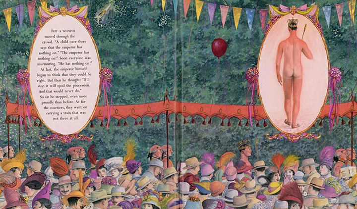 "Naomi Lewis's retelling of The Emperor's New Clothes (Walker Books, 2000) gave Barrett a longed-for opportunity to show some very different talents. It's set in 1913, at the end of the belle epoque, in an imaginary kingdom. The drawing is glorious and only an artist with Barrett's knowledge of fashion, and her hands-on experience of dress-making, could give this story such elegant, wickedly funny authenticity. And because "it's such a one-joke story", she has introduced a host of royal dogs, including a pompadoured poodle (himself half-naked) who blushes with embarrassment at the sight of the emperor's pink bottom."